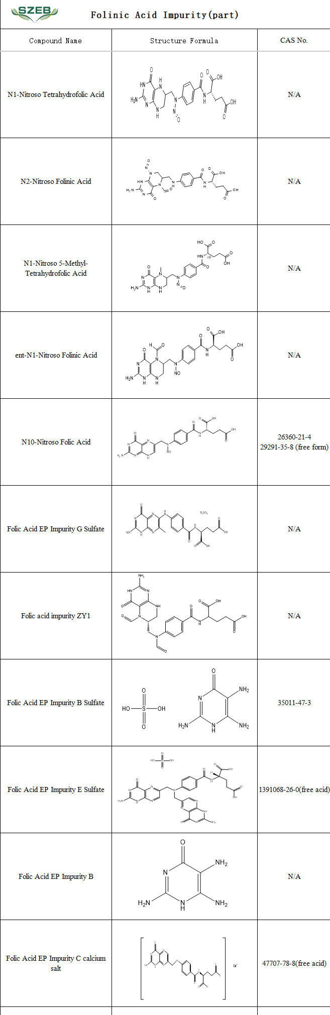 SZEB supplies a range of folic acid impurity reference standards, including folic acid nitrosamine impurities, USP/EP listed impurities, chiral/stereoisomer impurities, and other structural analogs. These products support pharmaceutical companies in the accurate identification, analysis, and evaluation of potential impurities, thereby ensuring drug safety and efficacy while accelerating the review process for generic drug development.