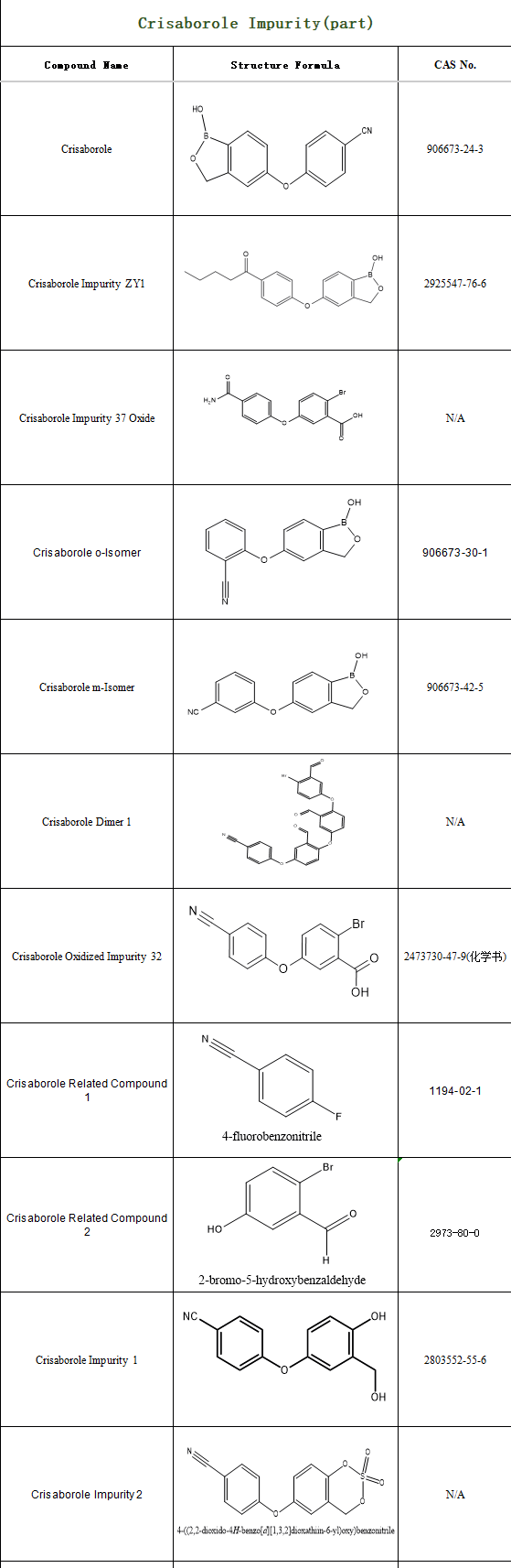 SZEB specializes in supplying crisaborole impurity reference standards. For more information on a wide range of selected impurities, visit the official website: www.ex-biotech.com .Contact us by e-mail:sales@ex-biotech.com .