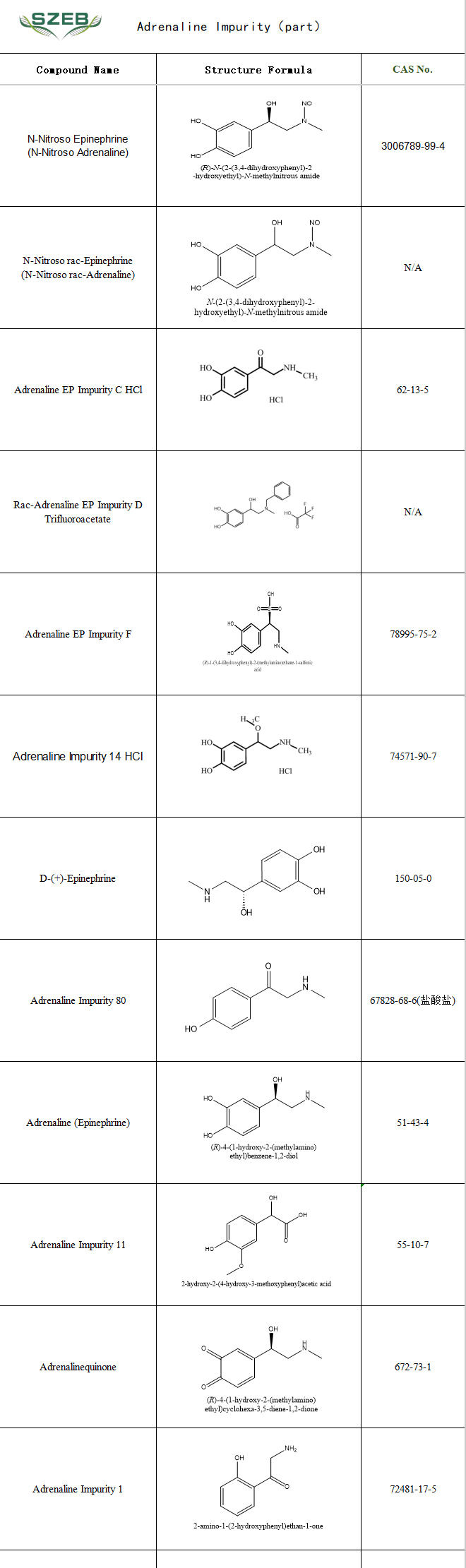 Stringent control of Adrenaline impurities is essential to ensure drug safety and efficacy. SZEB specializes in supplying Adrenaline impurity reference standards, including the N-NitrosoAdrenaline series and Adrenaline EP impurity series, to meet diverse experimental needs. These products support pharmaceutical companies in the research, production, and quality control of Adrenaline. For more details, visit our official website: www.ex-biotech.com , or e-mail:sales@ex-biotech.cn .