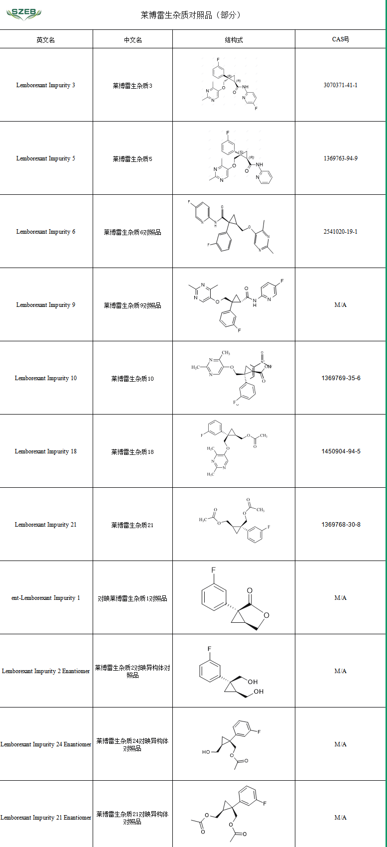 随着莱博雷生带来的失眠治疗药物的更新迭代,莱博雷生药物的质量控制变得更为重要,杂质监控要求也将更为严格。深圳卓越生物医药优势供应莱博雷生杂质对照品全套现货,为制药企业的研发生产以及质量控制提供专业支持。以下为部分目录,
