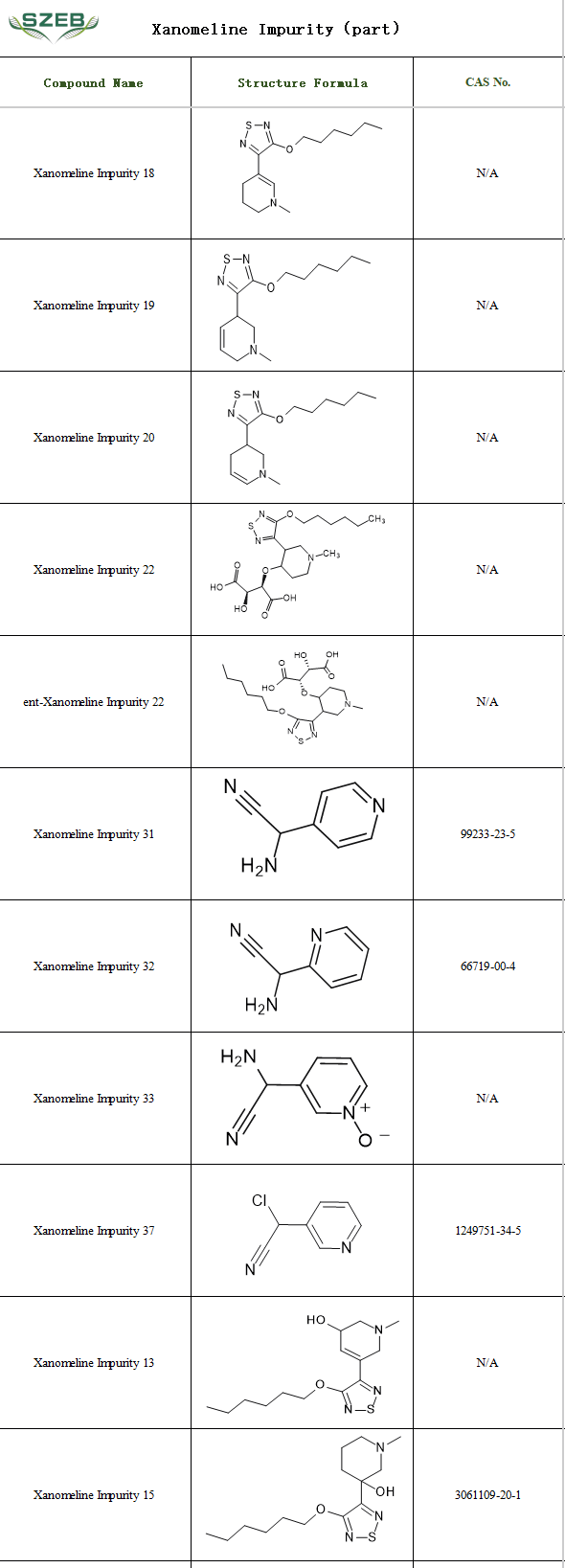 Shenzhen Excellent Biomedical Technology Co., Ltd. (SZEB) supplies a comprehensive range of xanomeline impurity reference standards, providing crucial support for quality control in the development of xanomeline-based pharmaceuticals. Visit the official website at www.ex-biotech.com for more information on impurities and updates on in-stock products.